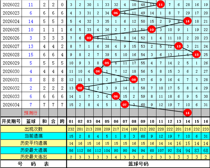 蓝球分析:前5期蓝球号码分手开出:04、08、02、06、07,其中偶数蓝球开出了4次,出现比例较高,本期展望蓝球再出偶数,参考蓝球号码14。