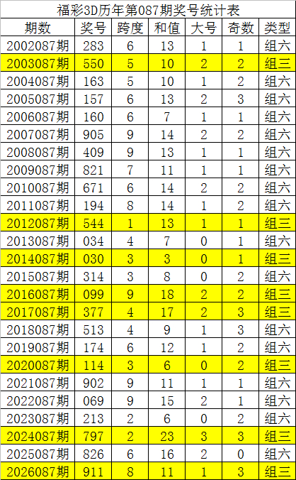 福彩3D第2026087期奖号为911。