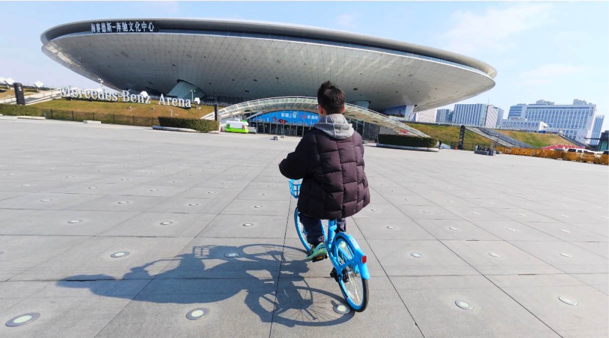 我赶到浦东“梅奔”旁的广场时,李隆顺已经准备好一辆共享单车,在那等着我。他皮肤黝黑,身形矫健,话不多,动作里有种沉静的节奏。和预想中不同,小李没有伸手帮忙扶车,只是站在一旁说:“我们先从平衡开始。”