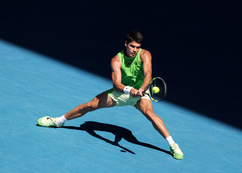 新华社照片,墨尔本(澳大利亚),股票配资十大平台2026年1月30日\n 1月30日,阿尔卡拉斯在比赛中回球。\n 当地时间1月30日,在墨尔本进行的2026年澳大利亚网球公开赛男单半决赛中,西班牙选手阿尔卡拉斯3比2战胜德国选手兹维列夫,晋级决赛。\n 新华社记者 马平 摄