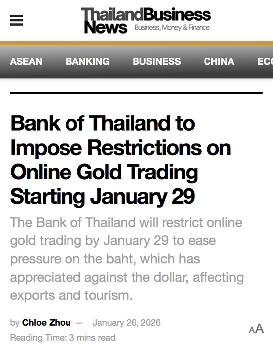 1月23日,泰国皇家公报公布新规,要求过去5年间年均黄金交易额超过100亿泰铢(约合3.23亿美元)的交易商,必须向泰国央行报告交易活动并保留3年交易记录,以提升市场透明度。1月21日,泰国央行首次公布黄金交易限额框架,初步设定每日5亿至10亿泰铢的宽泛区间;短短7天后,线上交易限额被大幅收紧至5000万泰铢,同时新增做空禁令,管控力度持续升级。