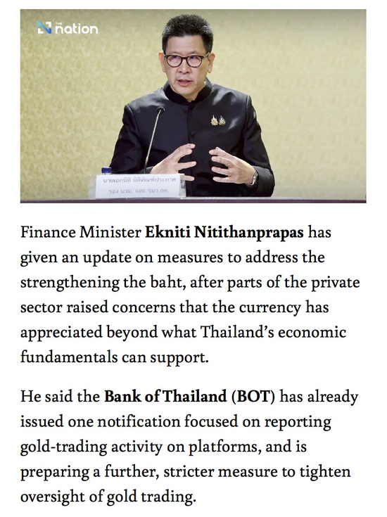 事实上,1月27日,泰国财政部长就曾提到,为缓解私营部门对于泰铢升值幅度过高的担忧,泰国央行已发布一份通知,要求平台报告黄金交易活动,并正在准备进一步的措施以收紧对黄金交易的监管。