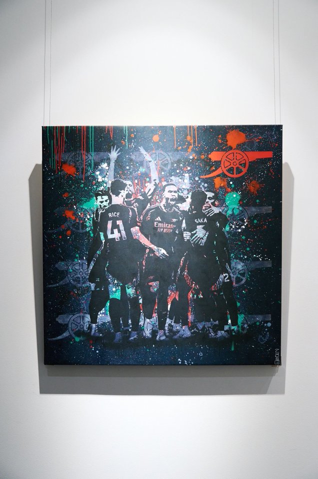 球员系列是整个展览中最能点燃个人记忆的部分。厄德高的灵光、赖斯的坚毅、萨卡的锋芒,还有传奇队长亚当斯穿越时光而来的铁血风骨,都以充满生命力的方式在画布上奔腾。艺术家的创作并未追求写实肖像,而是捕捉每位球员独一无二的“气场”,通过动作、色彩与动态线条传达情绪印象与精神特质。其中,《收藏品》系列作品的视觉灵感,来源于怀旧风格的交易卡,将阿森纳现役球员与历史上的传奇球员,转化为可收藏的艺术瞬间。